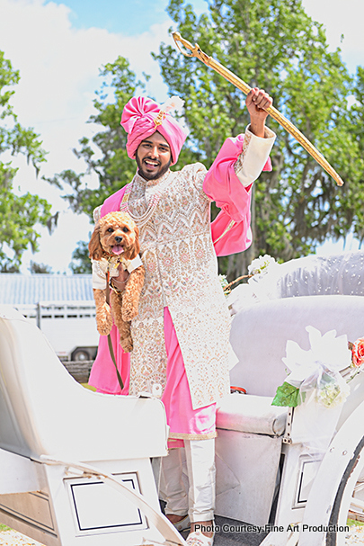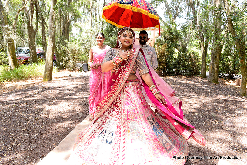 Pre-wedding events, including haldi and mehndi, were held at home with close family and friends, with decorations done by Zinkal’s family. The wedding ceremony took place outdoors, surrounded by trees with a mandap decorated in pinkthemed real flowers. The groom arrived on a horse carriage, adding a traditional touch to the festivities. The reception was held indoors in the barn, featuring blue and white real flowers. The newlyweds made a grand entrance with their family, dancing their way in.